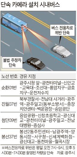 하루에도 같은 구간을 수십차례 반복하는 버스의 특성을 이용하여 주정차위반 단속을 한다는 기사입니다.