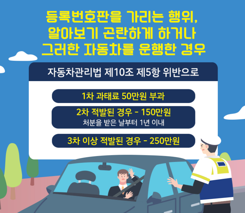 그러기에 고의로 가린다면 사고가 발생해도 추척하기가 어렵기에 가리거나 알아보기 곤란한 상태로 된 경우에는 과태료를 부과하는 것이죠.