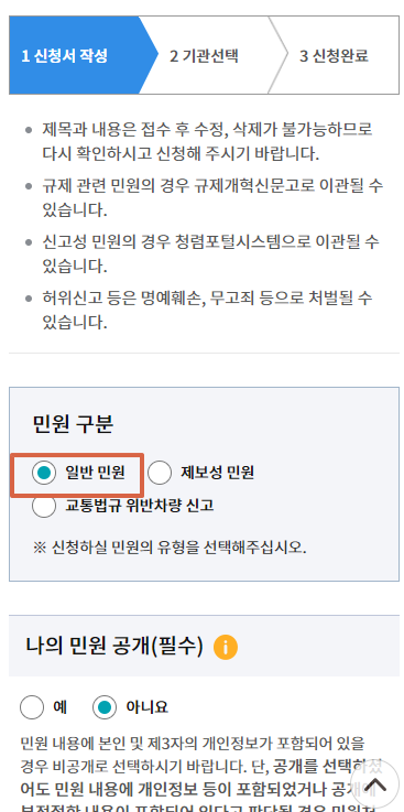 또 다음 페이지에서 나오는 민원구분에서 "일반민원" 체크하고 진행합니다.
