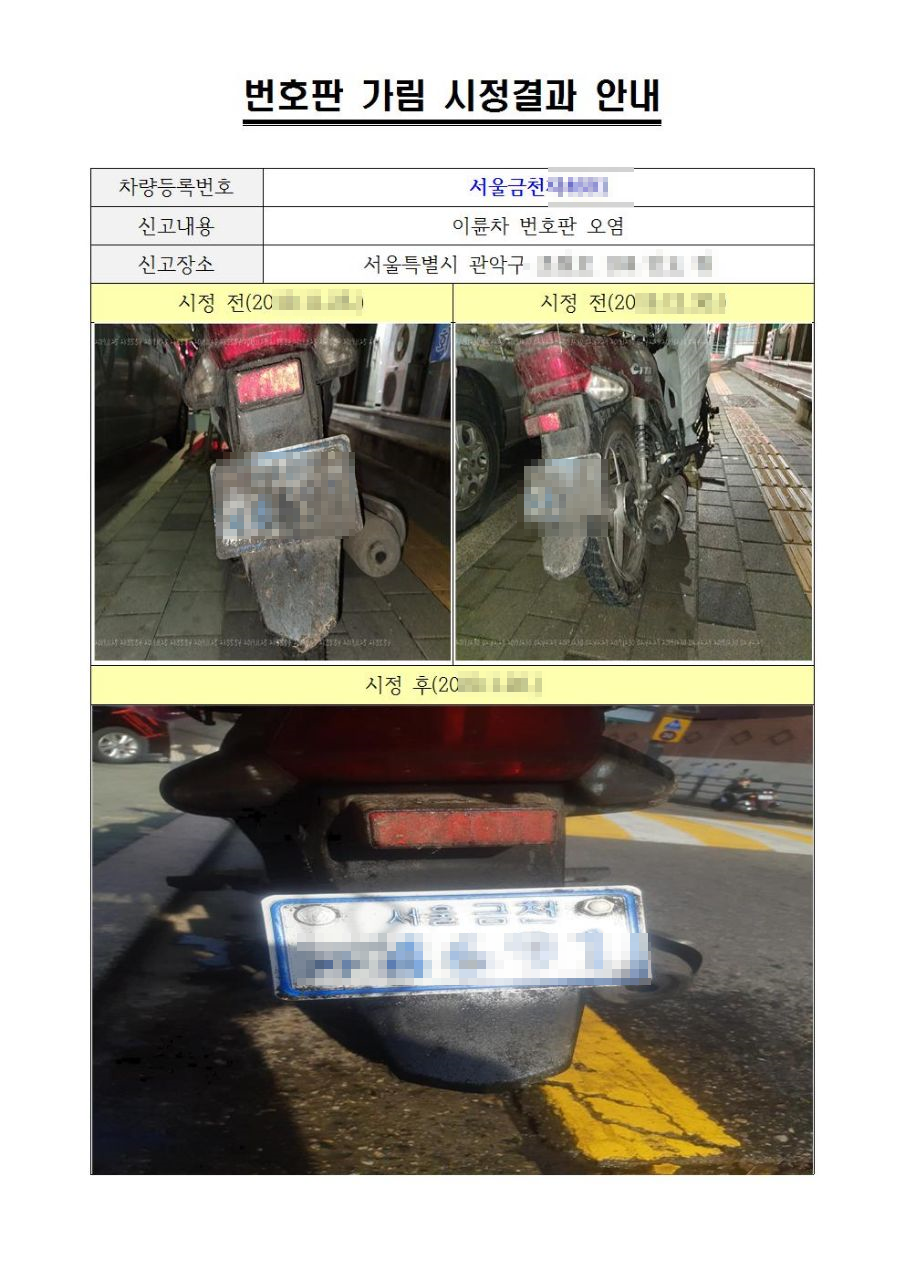 번호판 시정전과 시정후를 깔끔하게 알 수 있게 비교된 문서, 별도로 요청하지 않았는데도 불구하고 이렇게 처리하고 결과까지 알려주니 정말 기분 좋더라구요.