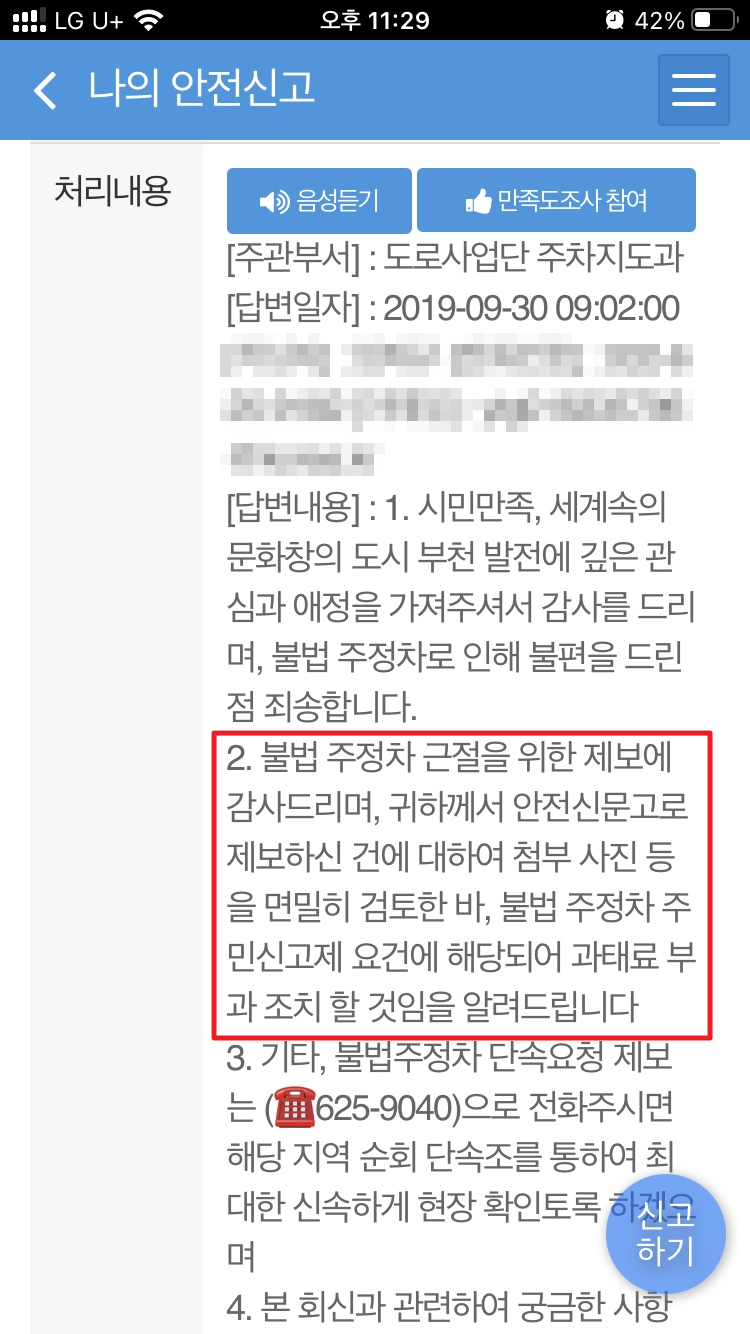 그 뒤로는 안심하고 안전신문고로 계속 신고를 하고 있습니다.