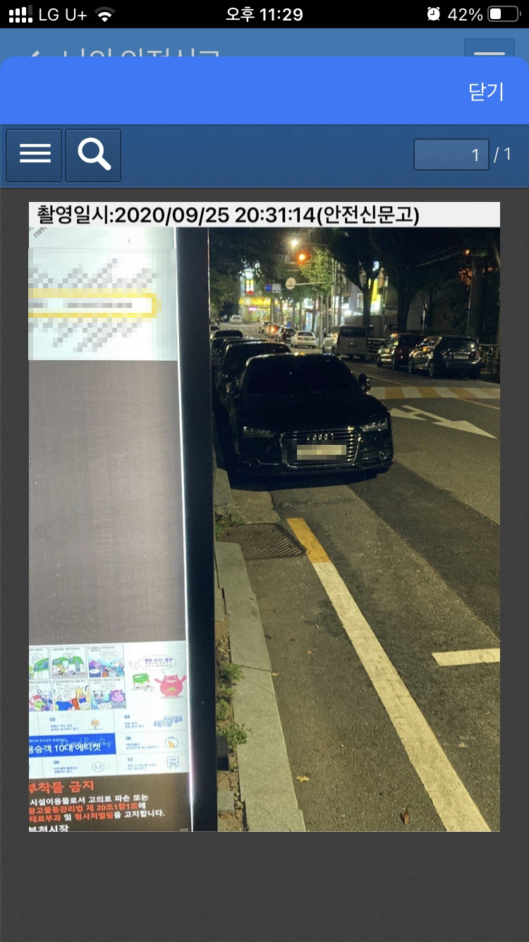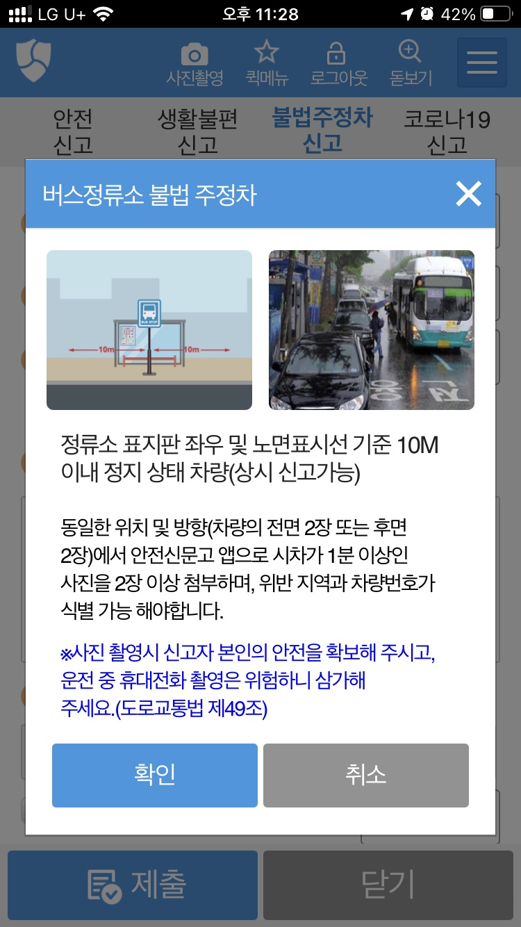 안전신문고를 이용하여 버스정류장 불법주차를 신고하려면 사진이 꼭 필요합니다.