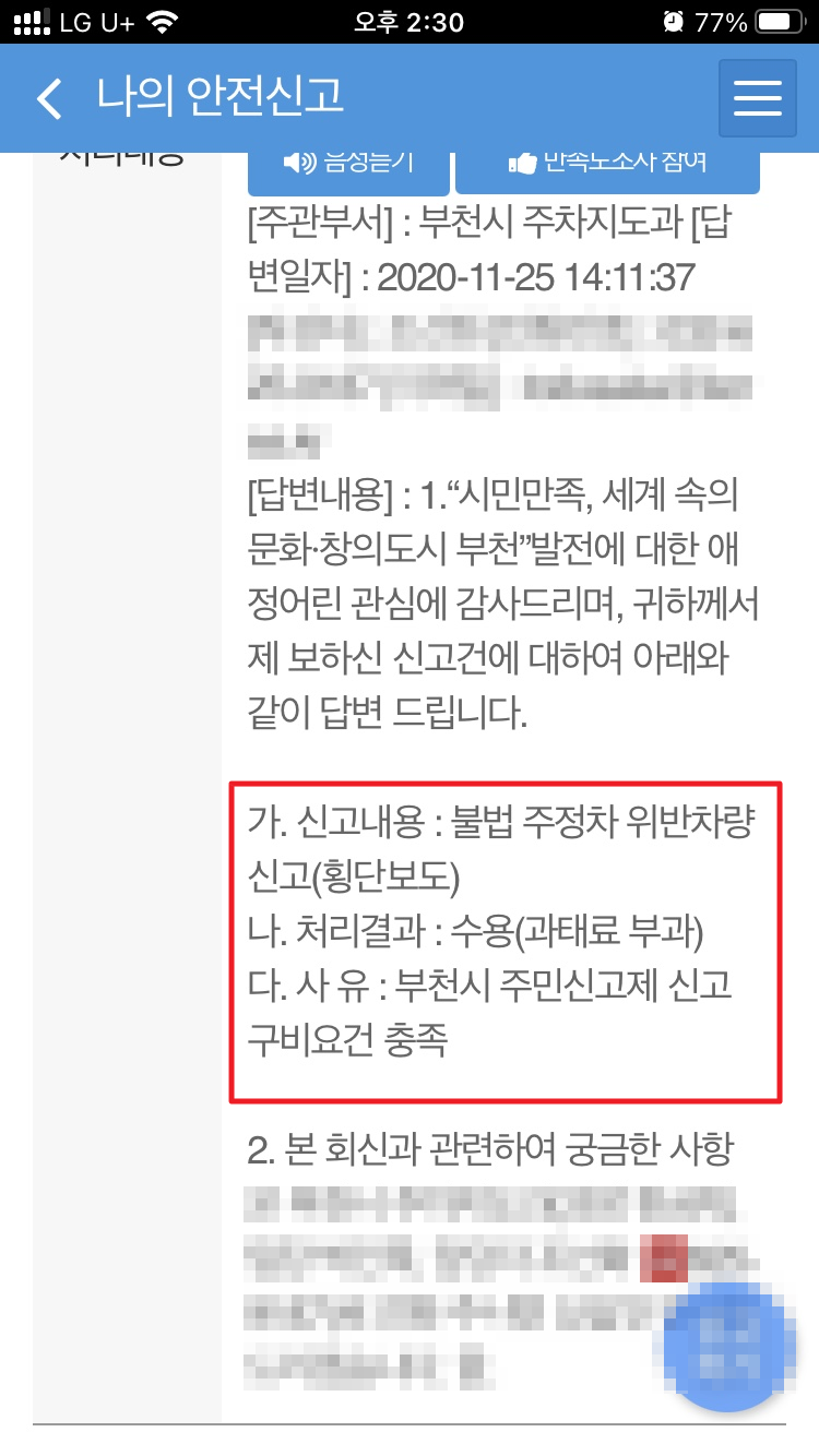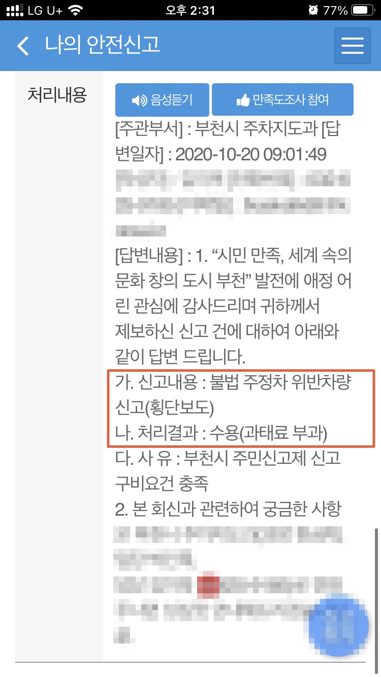 불법주차를 신고하고 나면 가장 궁금한 점은 무엇일까요? 아마도 과태료 부과여부가 제일 궁금합니다. 저도 제일 궁금한 점이 과태료 부과여부였는데요. 분명 회신에는 과태료 부과된다고 "수