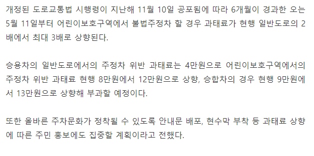 어린이 보호구역 불법주차에 대한 과태료 규정이 발표되었네요.