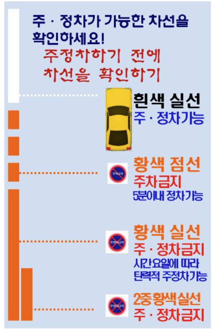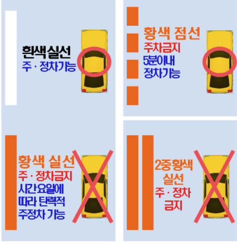 황색실선이 있는 곳에 차를 세우면 불법주정차라고 보시면 제일 이해하기 쉽습니다.