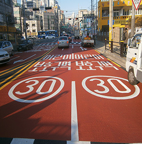 어린이 보호구역은 알아보기 쉬울 것입니다. 보통 노면에 적색으로 포장을 해놓고, 표지판도 있습니다.
