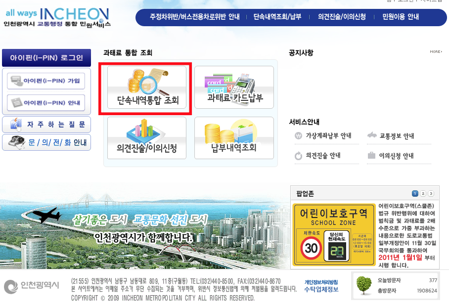인천시는 <인천광역시 교통행정 통합 민원서비스> 사이트를 통해 주차위반 과태료 조회, 버스 전용차선 위반 과태료를 조회할 수 있습니다.