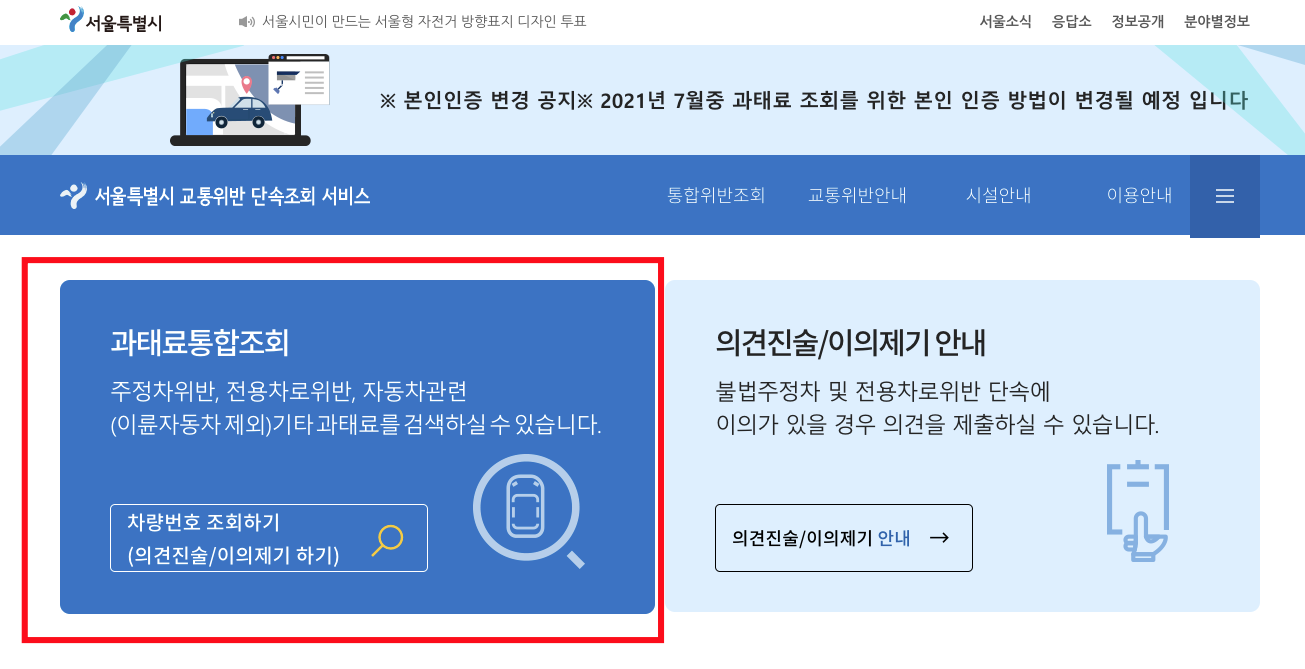 서울시는 <서울특별시 교통위반 단속조회 서비스>에 접속하시면 과태료를 통합조회가 가능합니다.