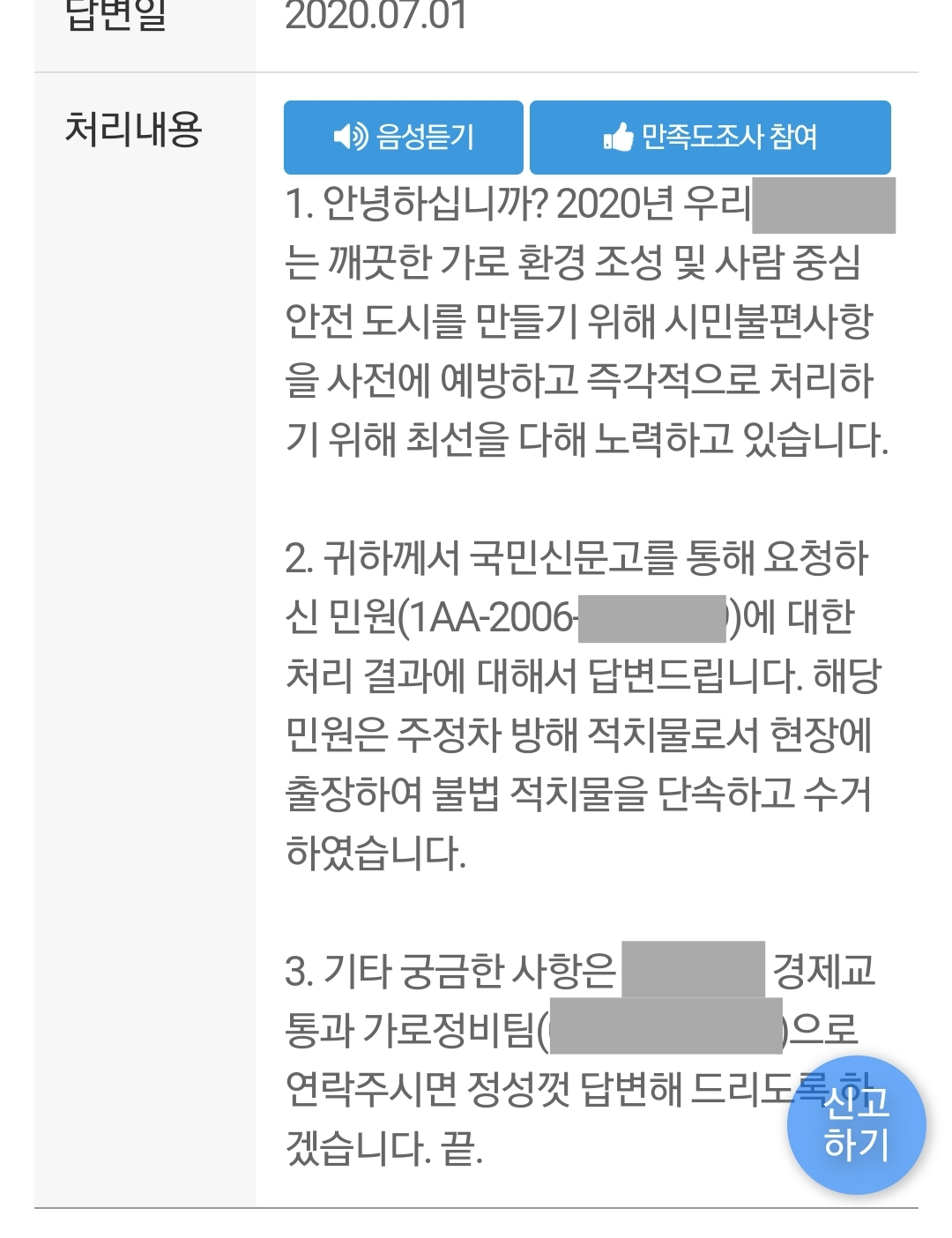 실제 신고한 결과를 보면 도로 방치물에 대해 불법적치물을 단속하고 수거했다고 나와있습니다.