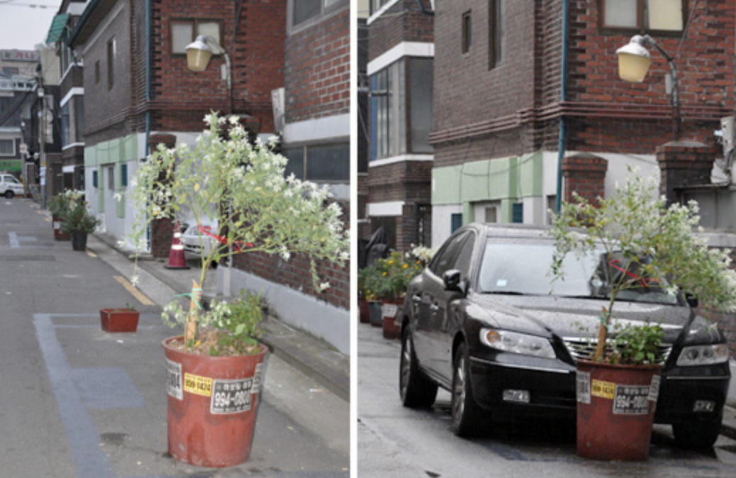 그냥 치우고 주차하는 방법도 있지만, 이 정도까지 물건으로 자리를 맡아둔다면