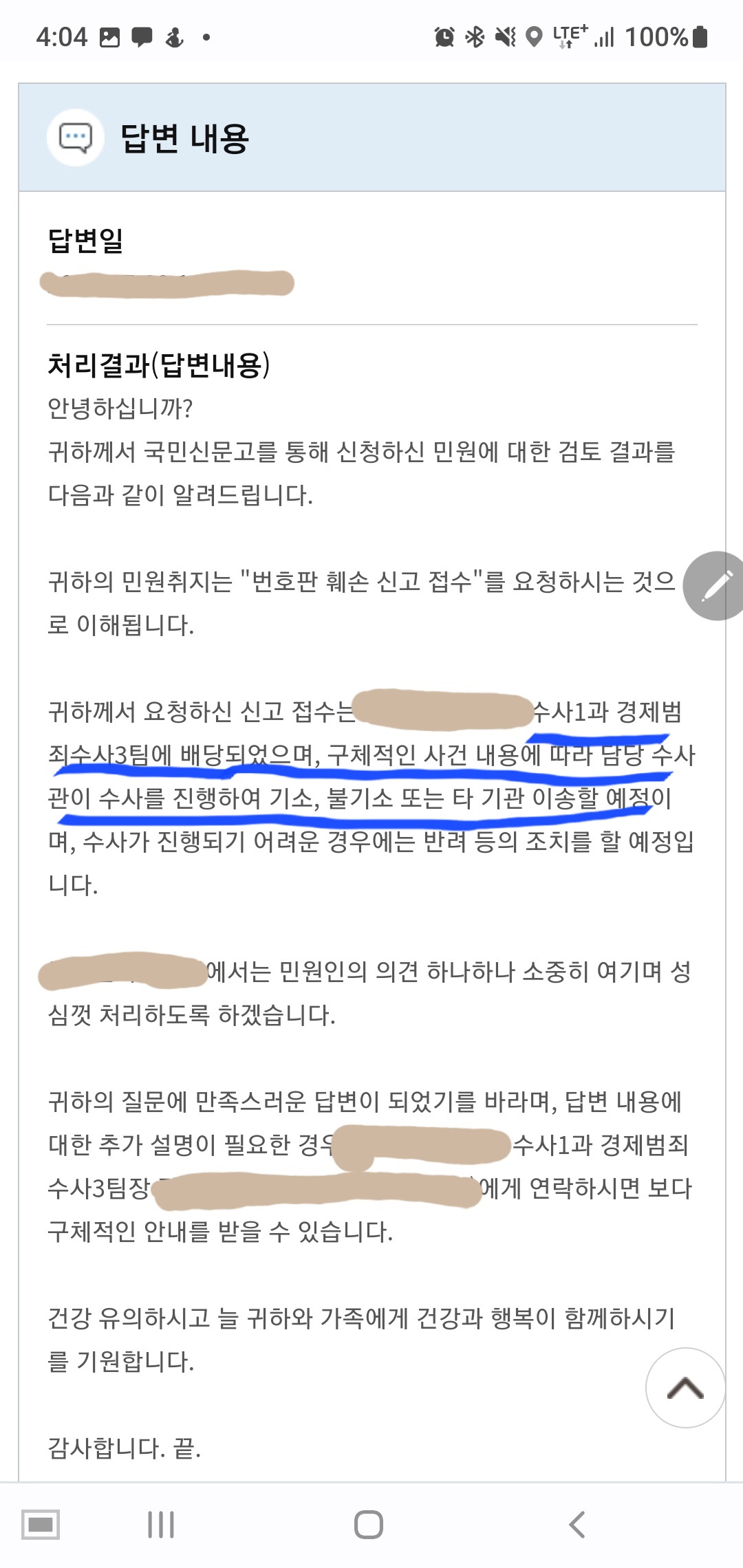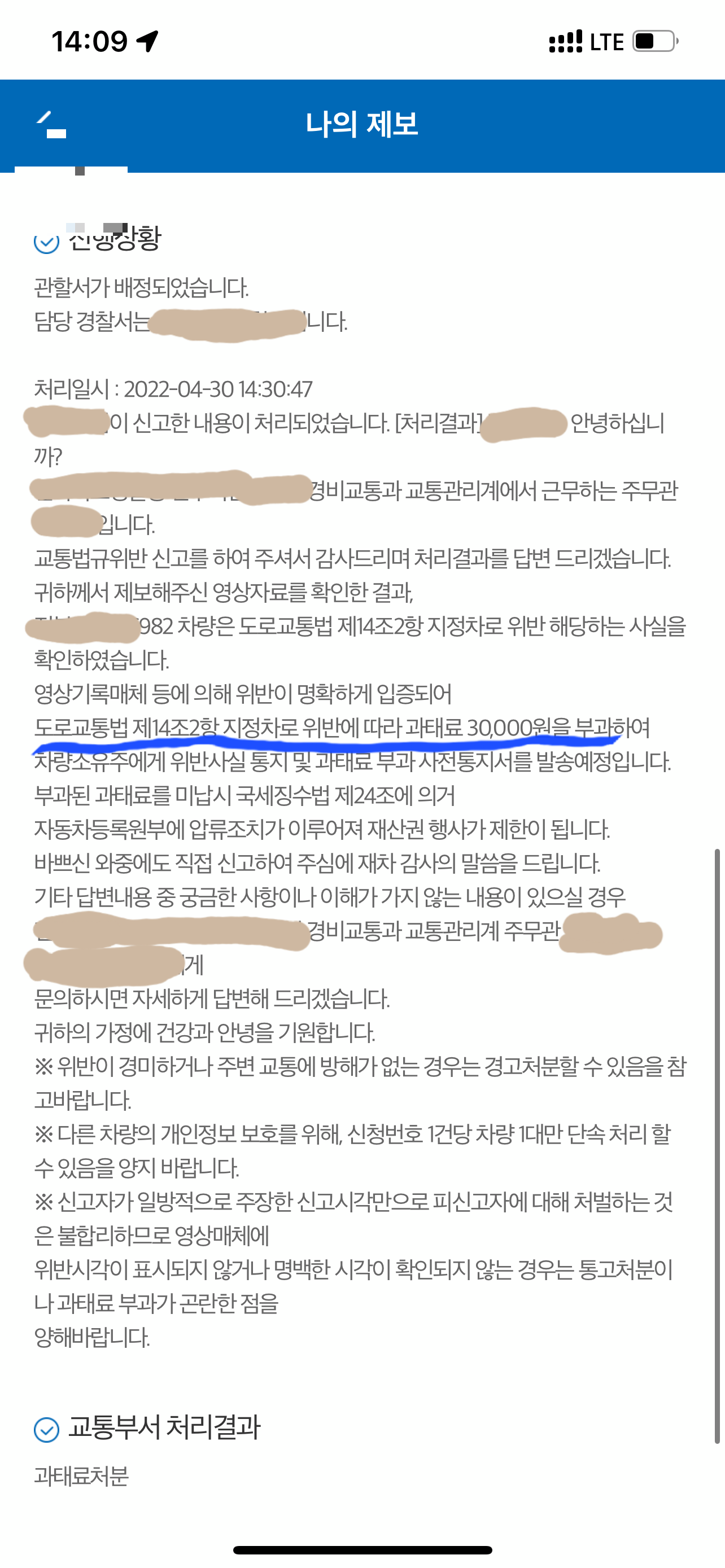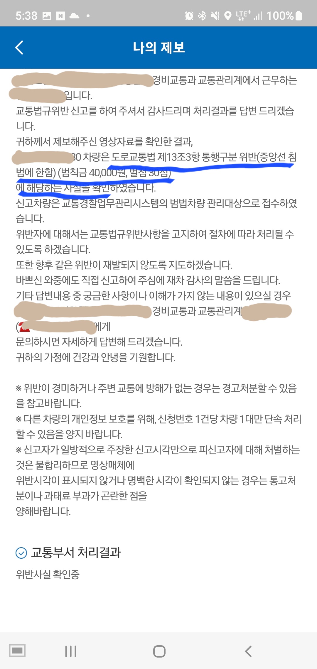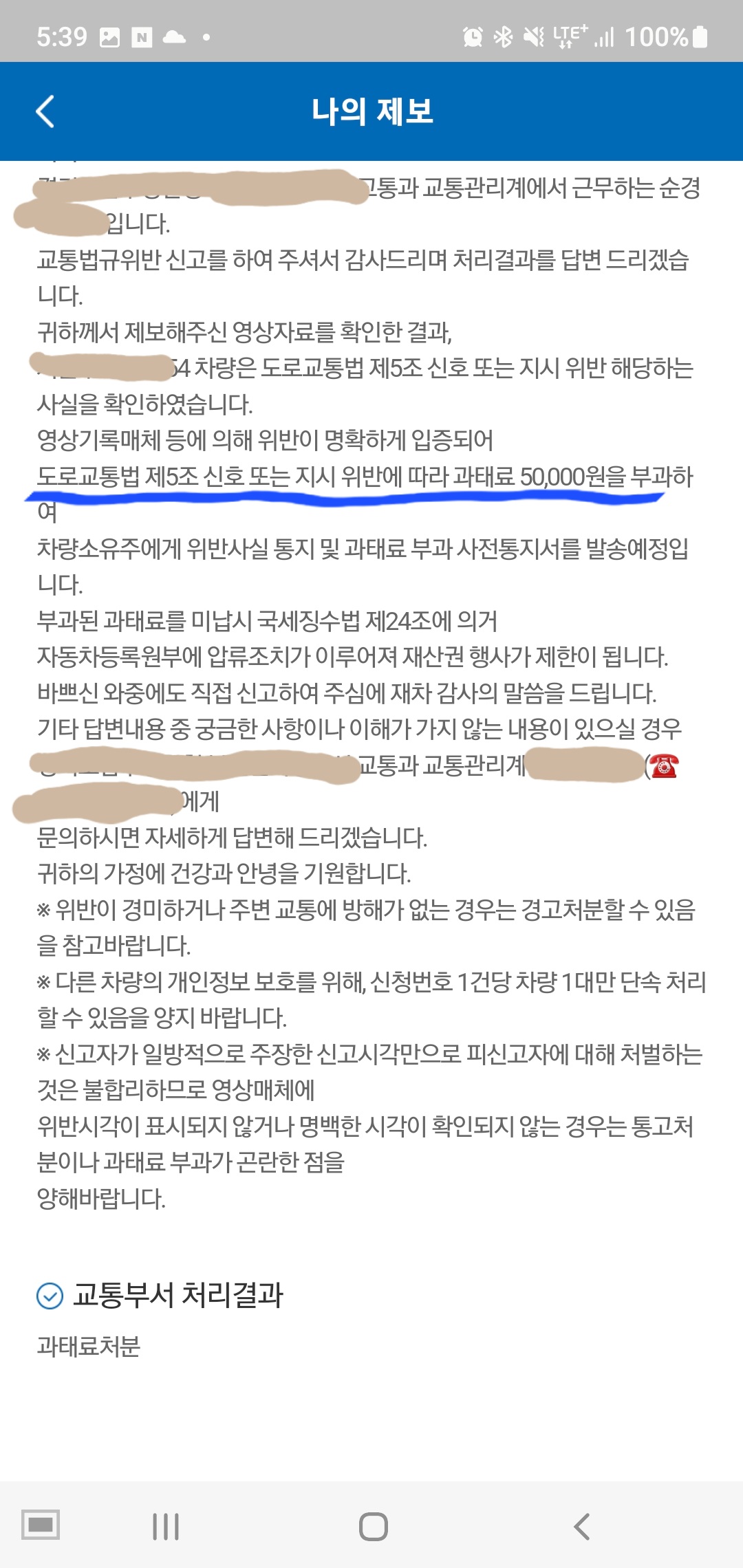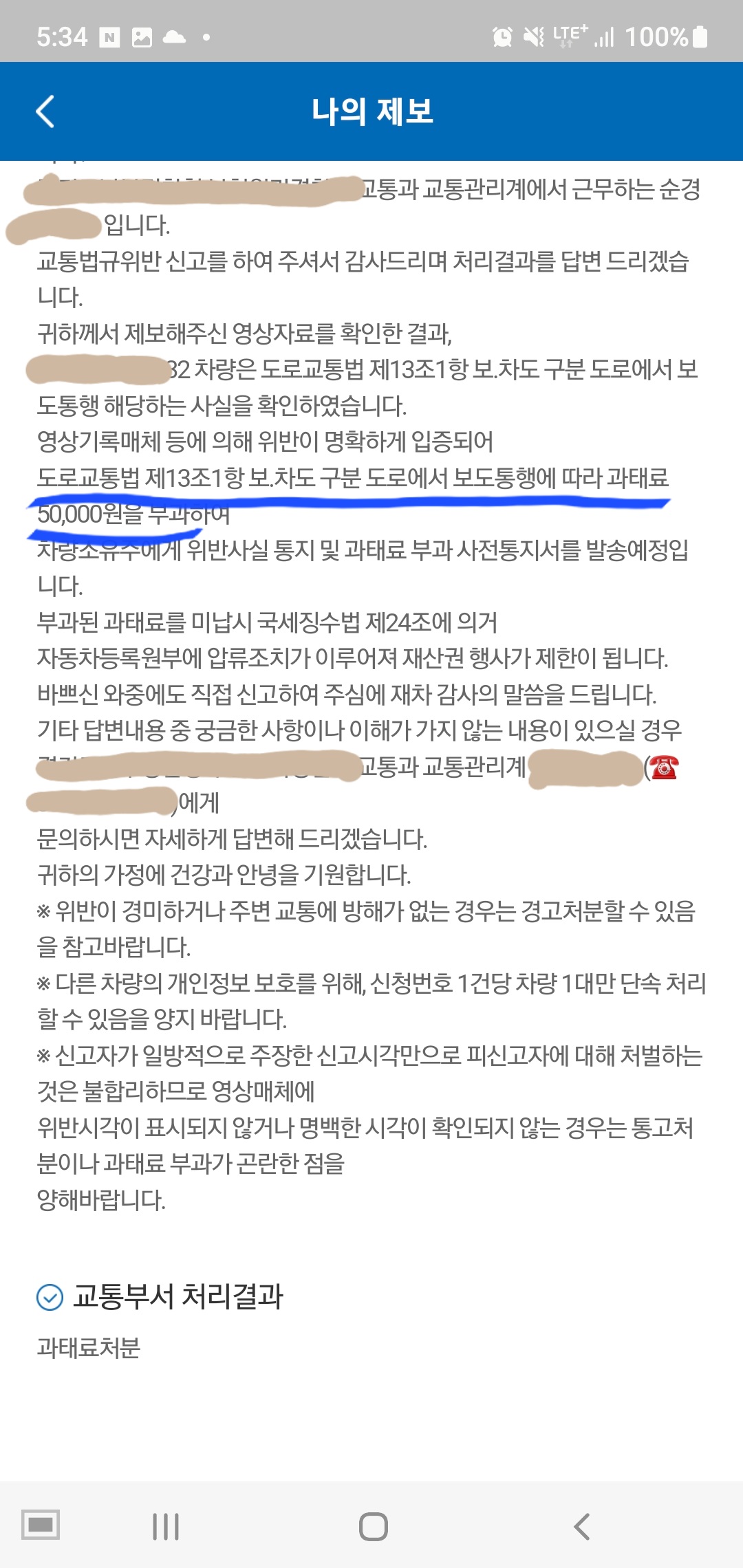 | 자동차 관리법 위반(번호판 오염 및 훼손) | 구청/시청 이관시(1차 : 원상복구명령, 2차 : 과태료 50만원) 경찰 수사배정시(형사고발) |