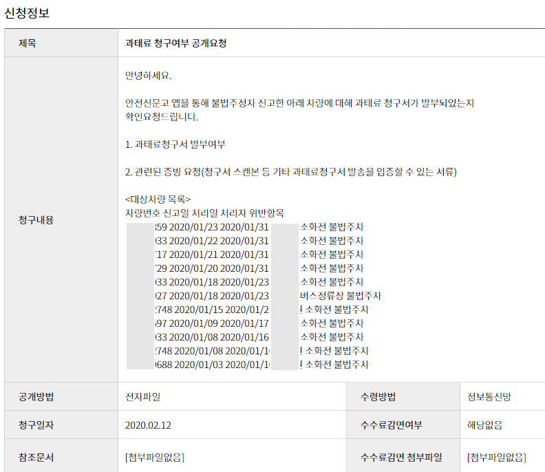 정보공개청구를 하면 과태료 청구가 제대로 되었는지 담당부서에서 확인 후 회신을 줍니다.